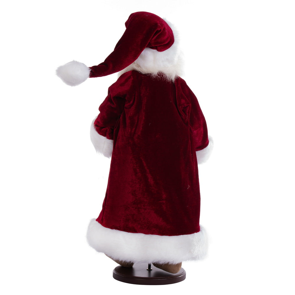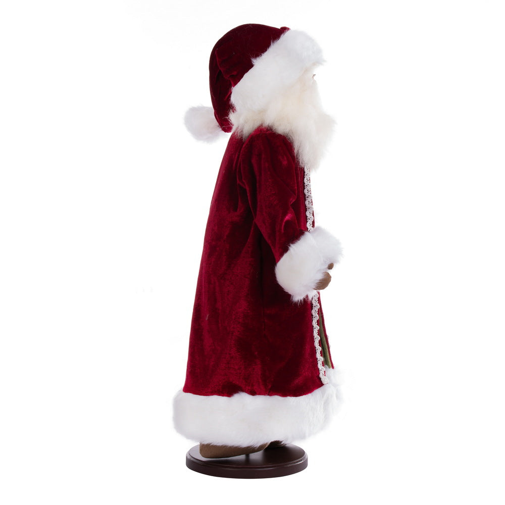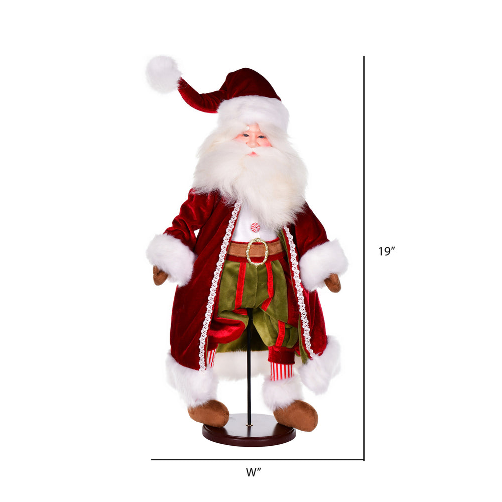 19" Deck The Halls Collection Santa Doll with Stand. This santa doll features a realistic resin face with glass eyes. This santa features real touch eyebrows, eyelashes, mustache and beard. This doll's wardrobe has green velvet trousers detailed with red stripes, candy button top, long red velvet coat lined with white lace and faux fur trim. The shoes feature brown velvet fabric and a faux fur top. The hat features a red velvet base accented with faux fur. This santa measures 19 inches from the bottom of the feet to the top of the head.