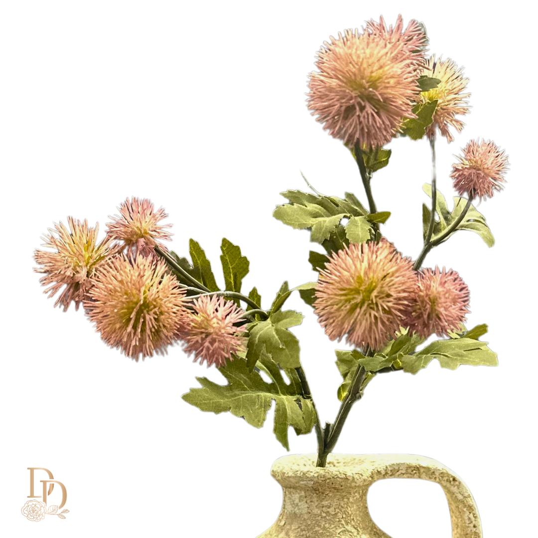 This 22" plum pom pom stem adds a touch of elegance and charm to any home. Its vibrant color and lifelike design make it a perfect addition to any floral arrangement or home decor. With its versatile size, it can easily be incorporated into any design. Transform your space with this stunning plum pom pom stem.