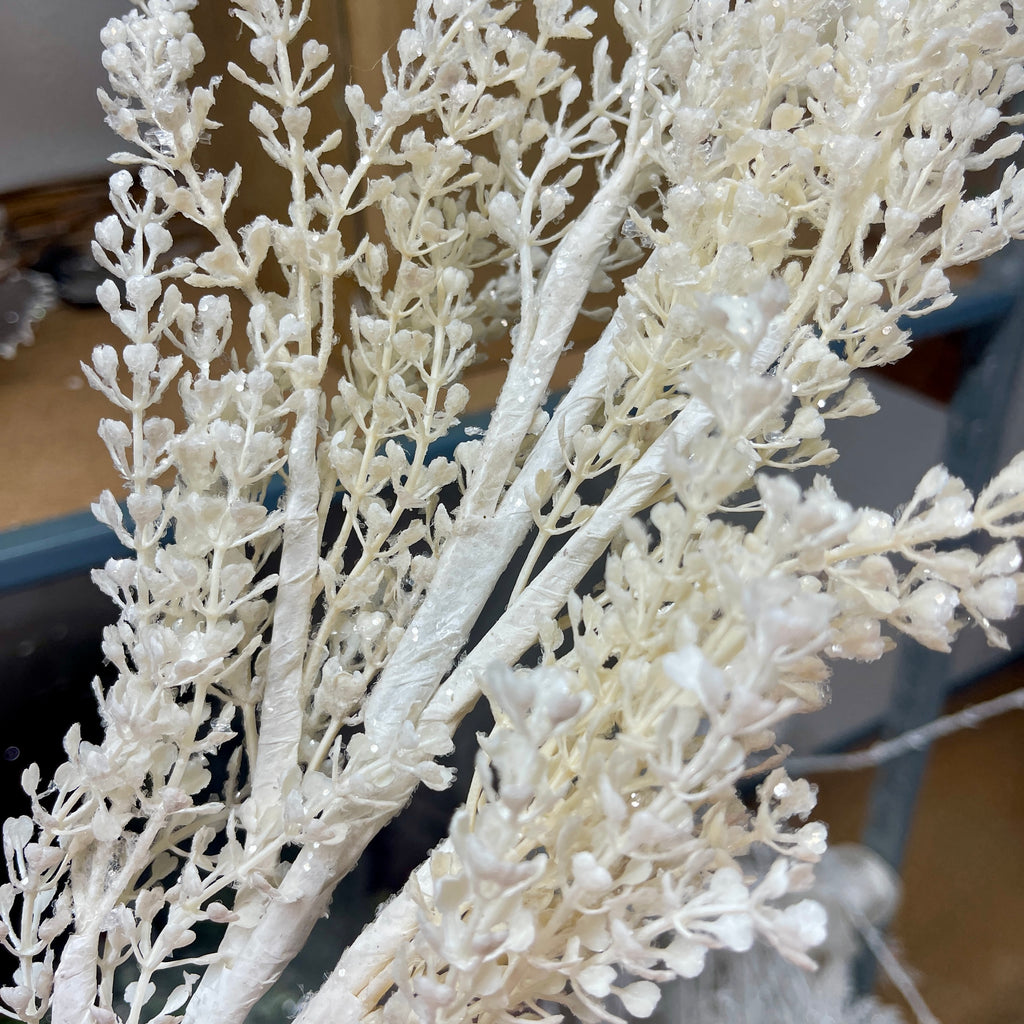 Elevate your winter decor with our 24" frosted leaf spray in winter white. Perfect for arrangements or as a unique addition to your Christmas tree. Embrace the season with a touch of elegance and sophistication.