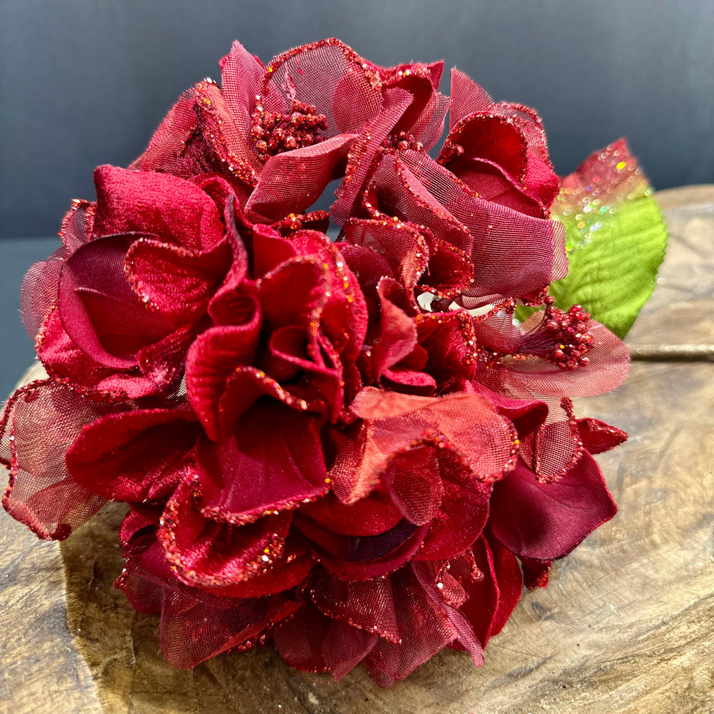 Indulge in luxury with our 29" Red Velvet Hydrangea Stem. The stunning red velvet petals with sparkly edges are reminiscent of a rich, decadent fabric. Elevate any space with the elegance and sophistication of this statement piece.