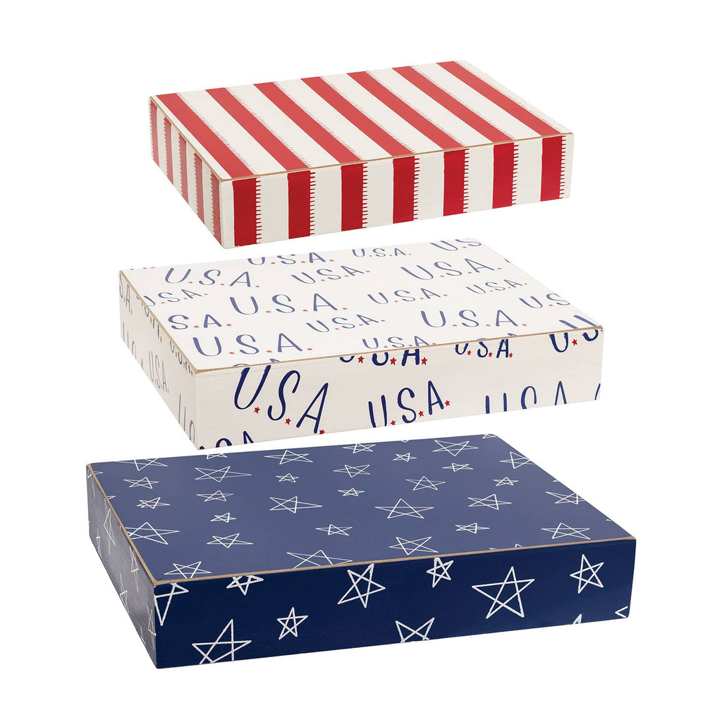 Americana Nesting Risers are versatile decor pieces that bring bright style to seasonal displays. Made from painted wood, each features distressed edges for a rustic look. They can be stacked together or used to elevate other decorative elements. One riser features a red and white stripe pattern, one is white and patterned with a repeating blue and red “USA,” and one is navy blue with a doodle-style white star pattern. The risers can nest together for slimmer storage. The small riser measures 8.5” high by 6” wide by 1.5” deep, the medium measures 9.5” high by 7.25” wide by 1.75” deep, and the large measures 11” high by 8.5” wide by 2” deep.