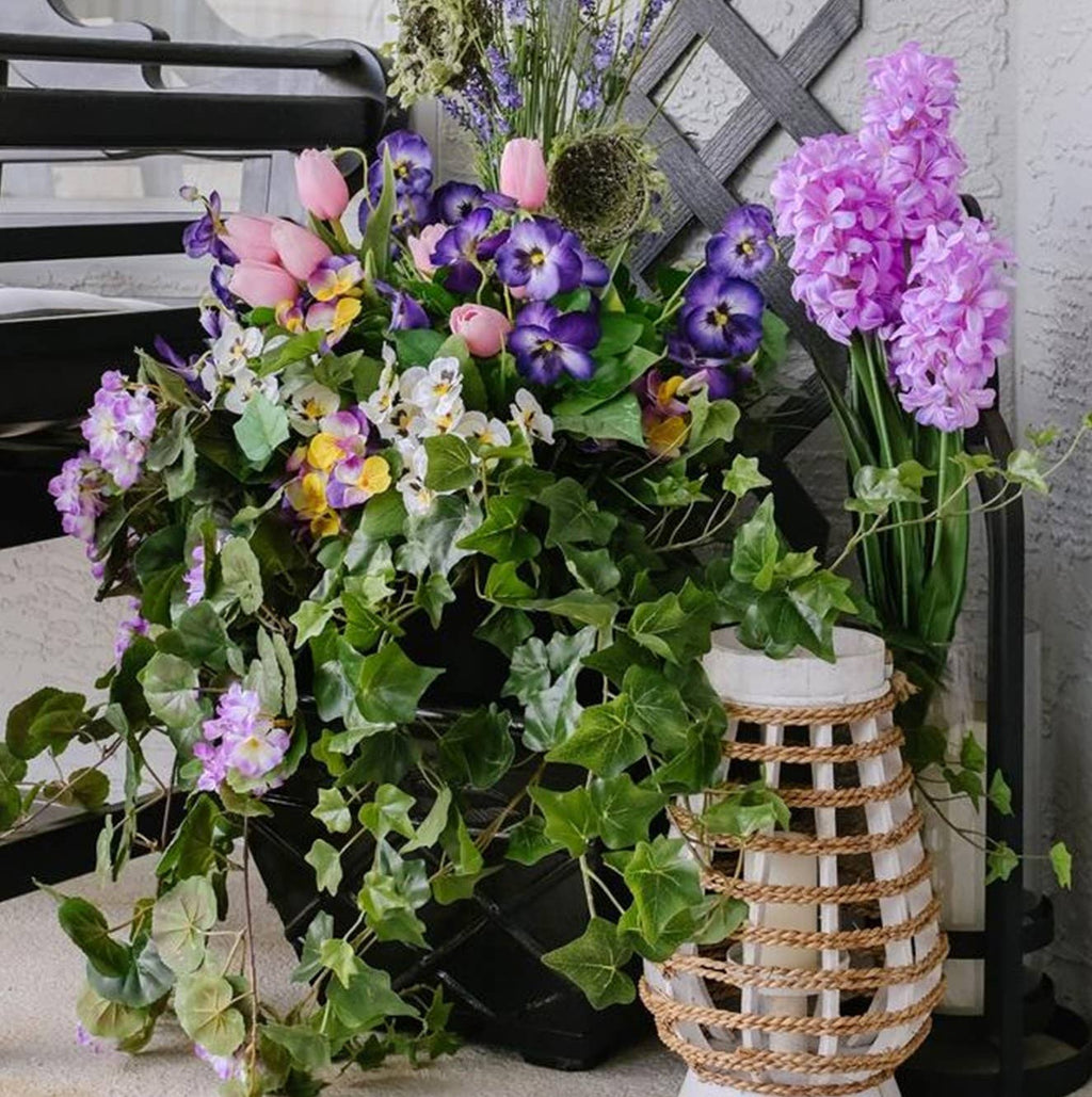 The Real Touch Flocked English Ivy Bush, designed to bring a natural, lifelike touch of greenery to any setting. Measuring 30 inches long, this ivy bush features a multitude of stems extending from a thick, knobby-textured base. The large and small ivy leaves, in varying shades of light and dark green, are beautifully flocked for a realistic appearance. The wired stems allow for easy shaping and positioning, making it ideal for a variety of arrangements. Suitable for both indoor and outdoor decor Perfect for floral arrangements, wreaths, and home or event décor, this ivy bush adds a lush, natural touch with minimal maintenance.