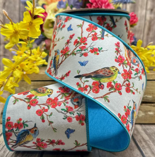 Bring Whimsical Nature to Any Project! Add a charming, garden-inspired touch to your floral arrangements, wreaths, gift wrapping, or décor with this 4" x 10yds Dupioni Quince Blossoms with Birds Ribbon – Coral, Blue, and Yellow. Featuring delicate watercolor quince blossoms and playful birds, this ribbon brings a hand-painted, lively look to any craft or décor project.