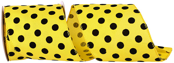 Unleash your creativity with our 4" Yellow| Black Velvet Dots | Linen | Wired Edge Ribbon. The vibrant yellow paired with the luxurious black velvet dots add a touch of sophistication to any project. The sturdy linen material and wired edge provide easy maneuvering and durability. Each roll contains 10 yards of premium ribbon. Elevate your crafts with this exclusive ribbon now.