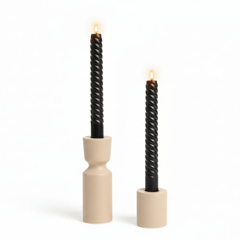 This striking set of two 9-inch flameless taper candles in deep black features an elegant spiral-line texture and a warm flickering flame. A modern twist on classic taper candles—perfect for creating mood lighting with a gothic or seasonal edge, all without the mess or worry of open flame.