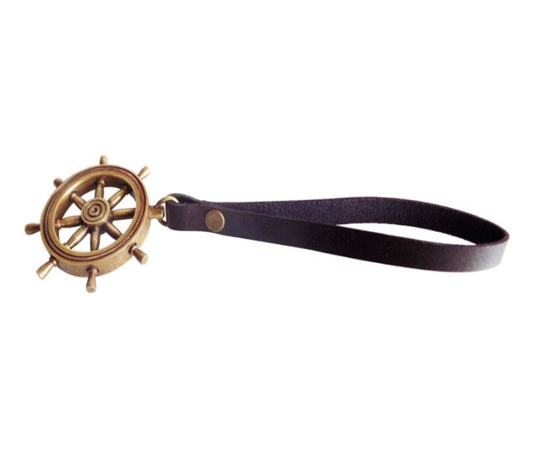 9" Brass and Leather Ship's Wheel Ornament with Strap