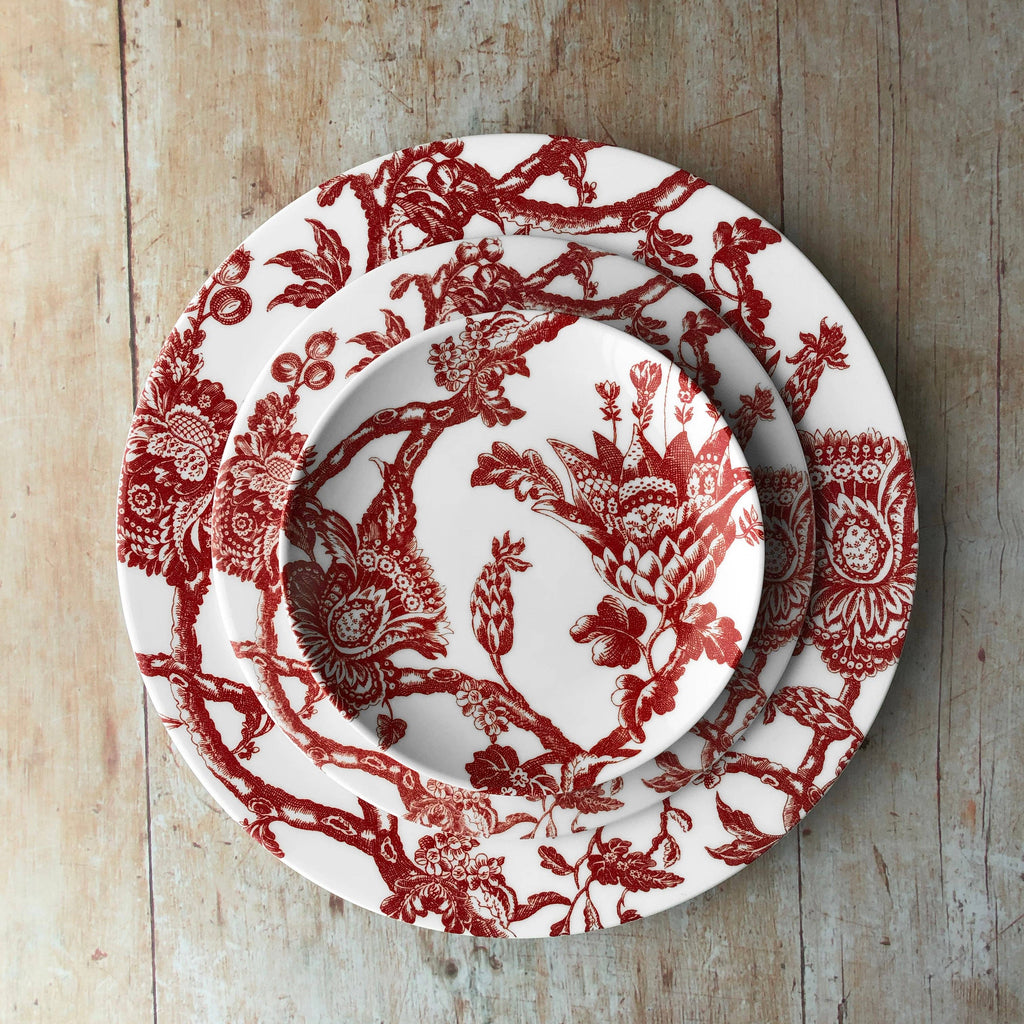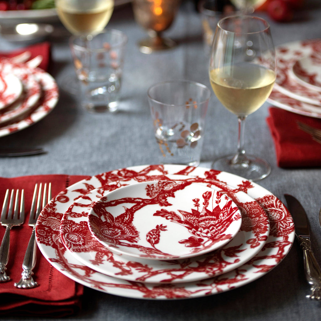 Arcadia draws its inspiration from an antique tapestry the archives of the Williamsburg Foundation, reimagining scale and color to create a collection that's perfectly suited for today. This porcelain collection, re-imagined in rich crimson red, brings high style to the holiday table, or use it to add a sophisticated splash of color to every day.