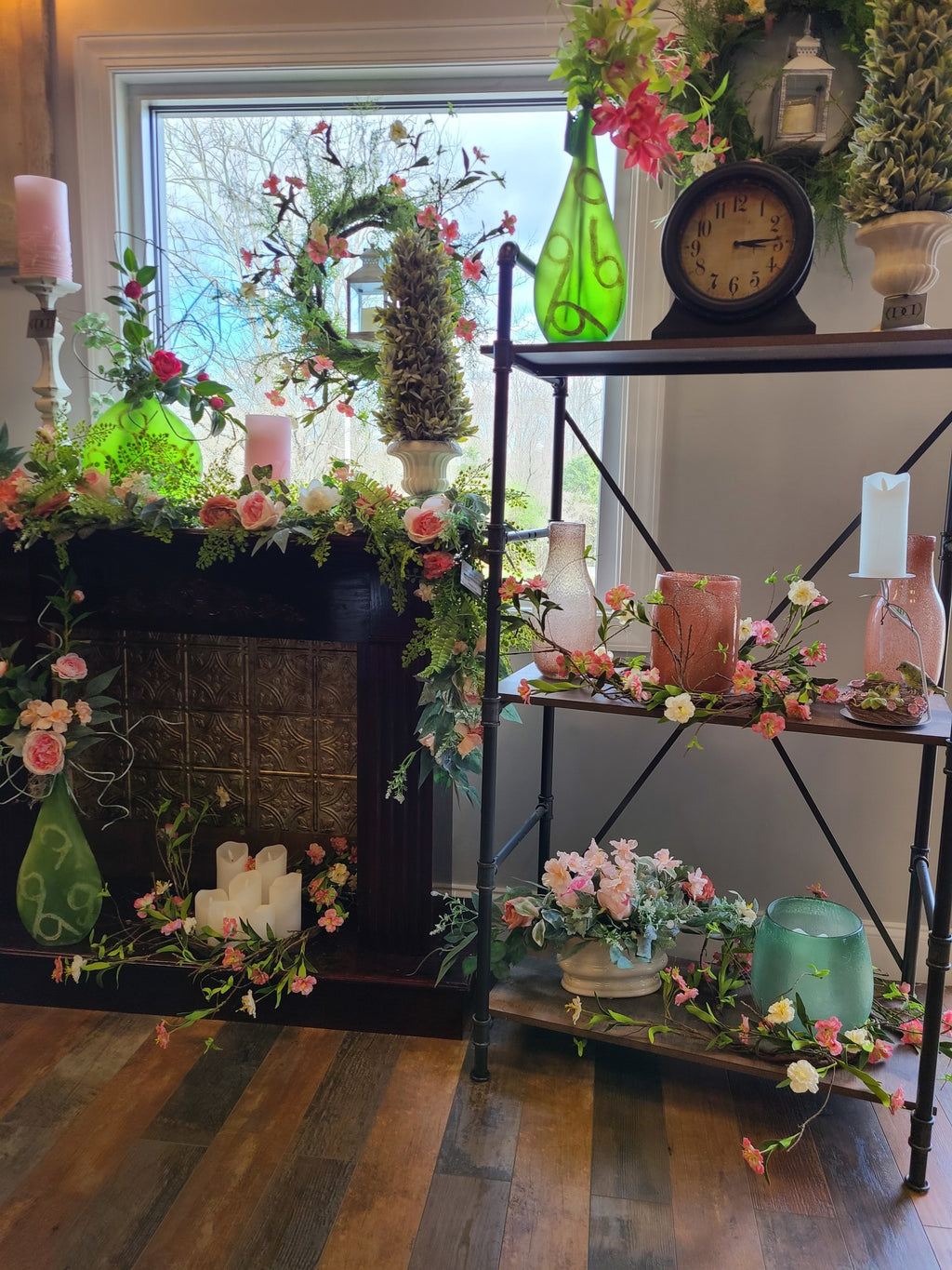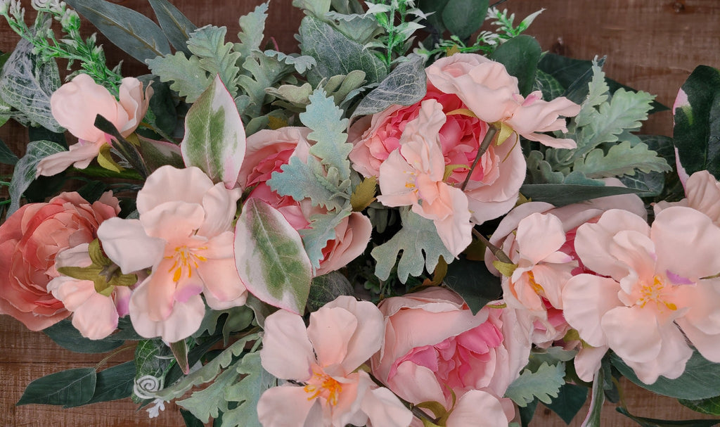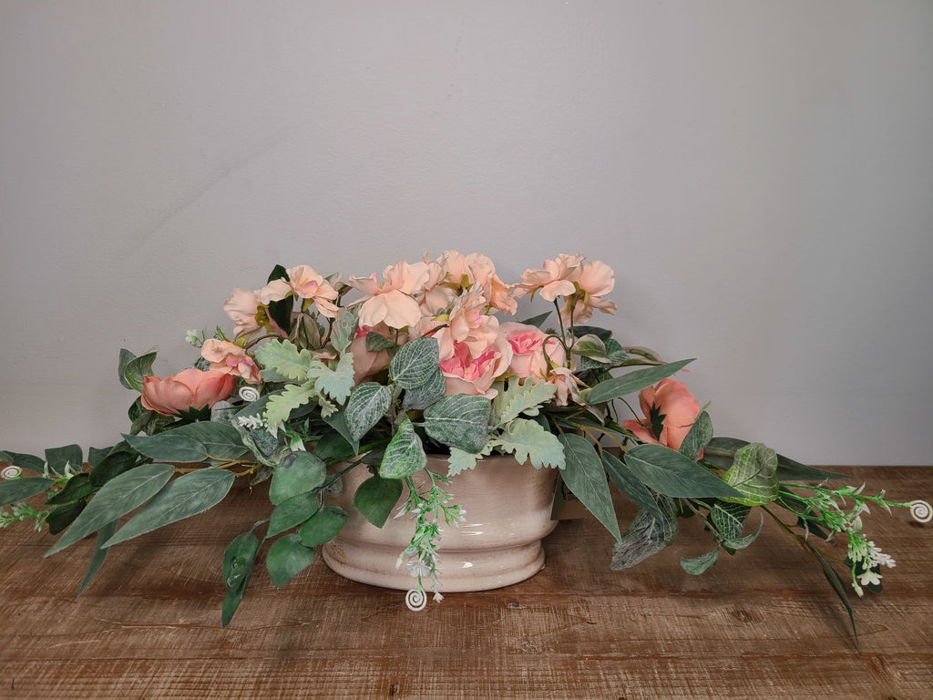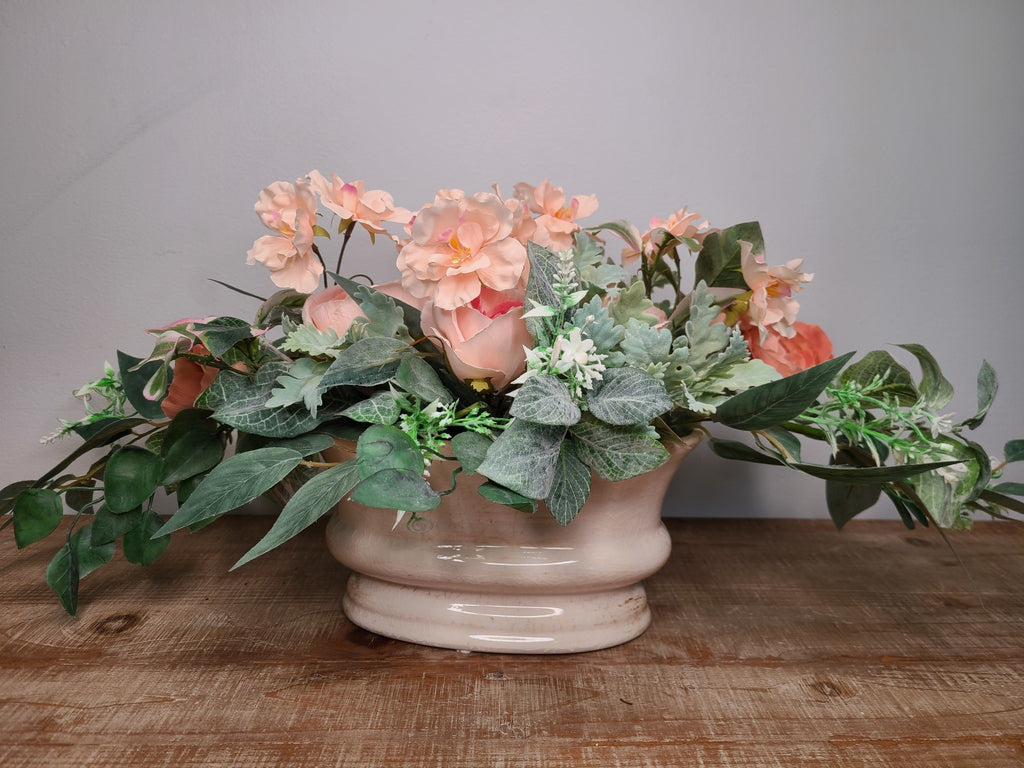 This low oval cream planter filled with pale pink ranunculus, dusty miller and mint greens is a simple but elegant vintage look. Add this to your table and be sure to get noticed!