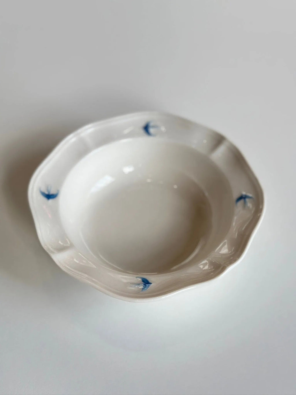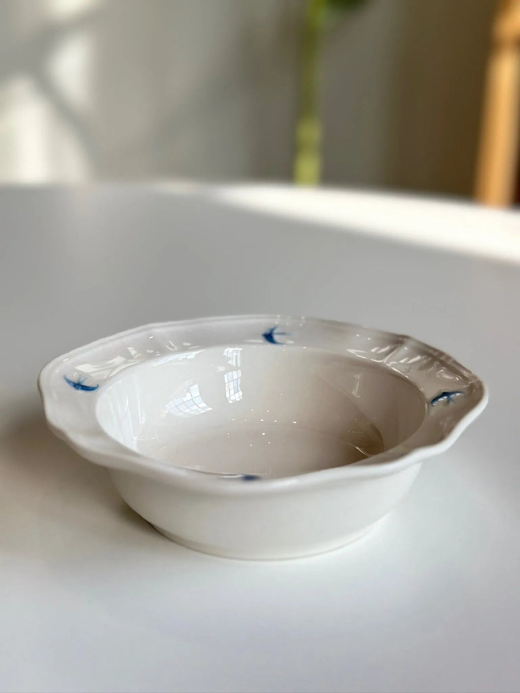 A delightful fusion of whimsy and elegance, this ceramic bowl features delicate bluebirds gracefully adorning its scalloped rim. The pristine white glaze provides a perfect canvas for the charming avian motif, while the gently curved silhouette adds a touch of timeless sophistication to your table setting.