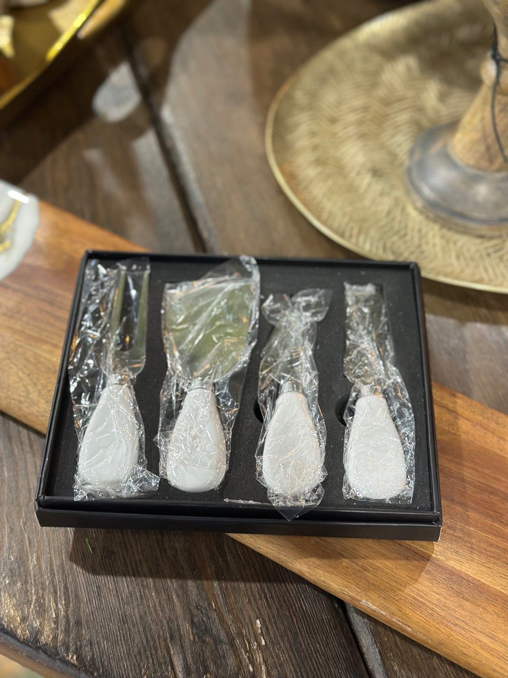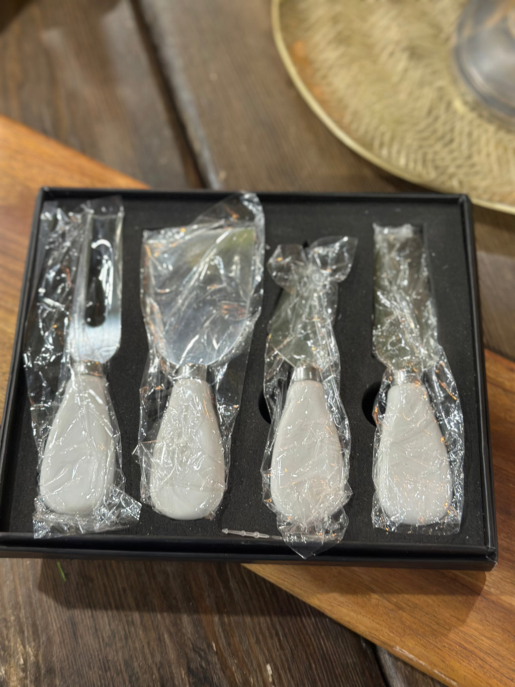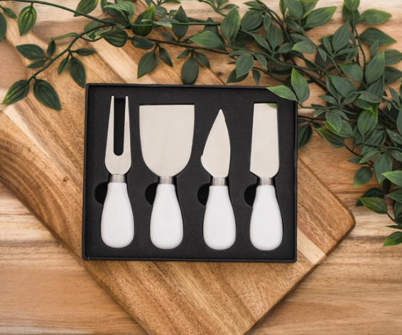 Introducing two new 4 piece stainless steel cheese knife sets with a gift box! We now offer a 4 piece cheese knife set with Acacia Wood handles and a 4 piece cheese knife set with white ceramic handles. These beautiful cheese knives are made from high quality stainless steel and come with a solid handle and packaged together in an elegant black gift box.