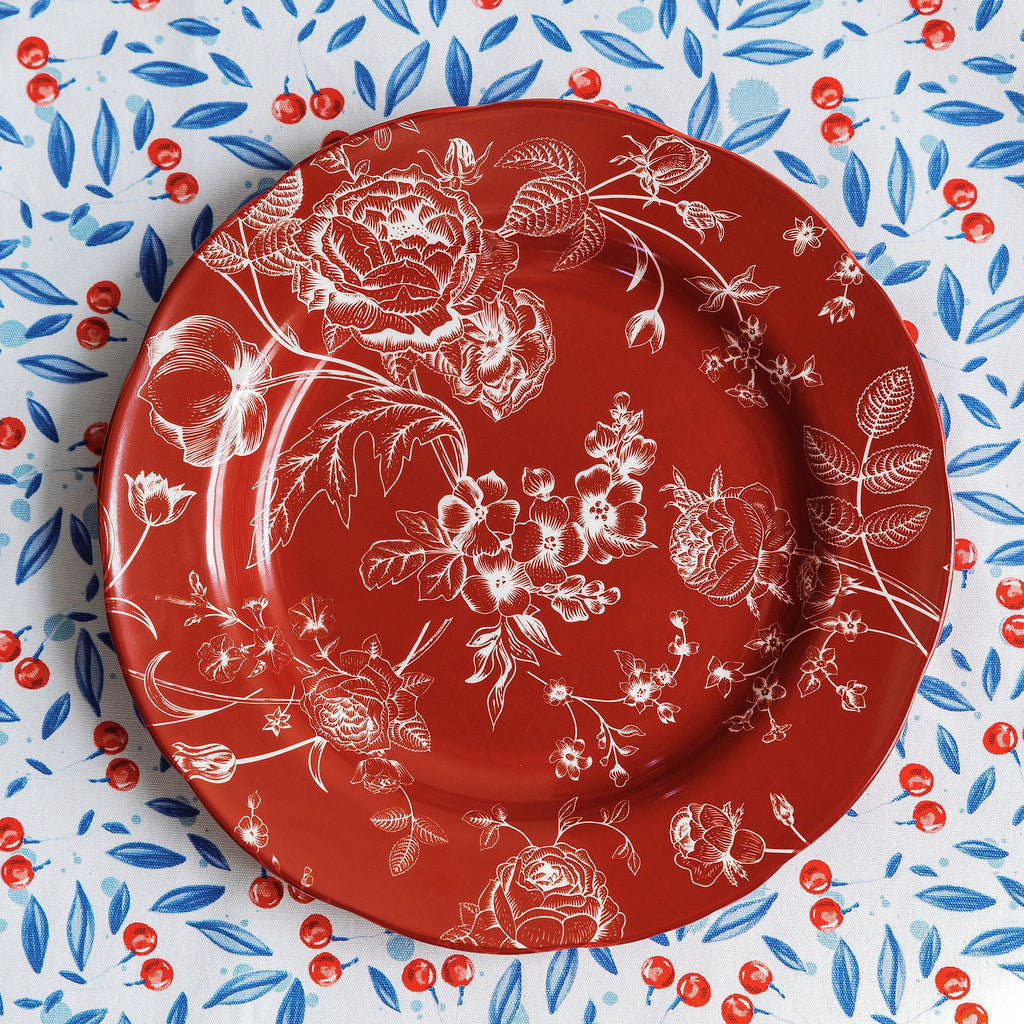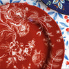 This premium dinnerware piece features an elegant crimson background adorned with delicate white botanical illustrations of peonies, birds, and garden motifs in a classic chinoiserie style.