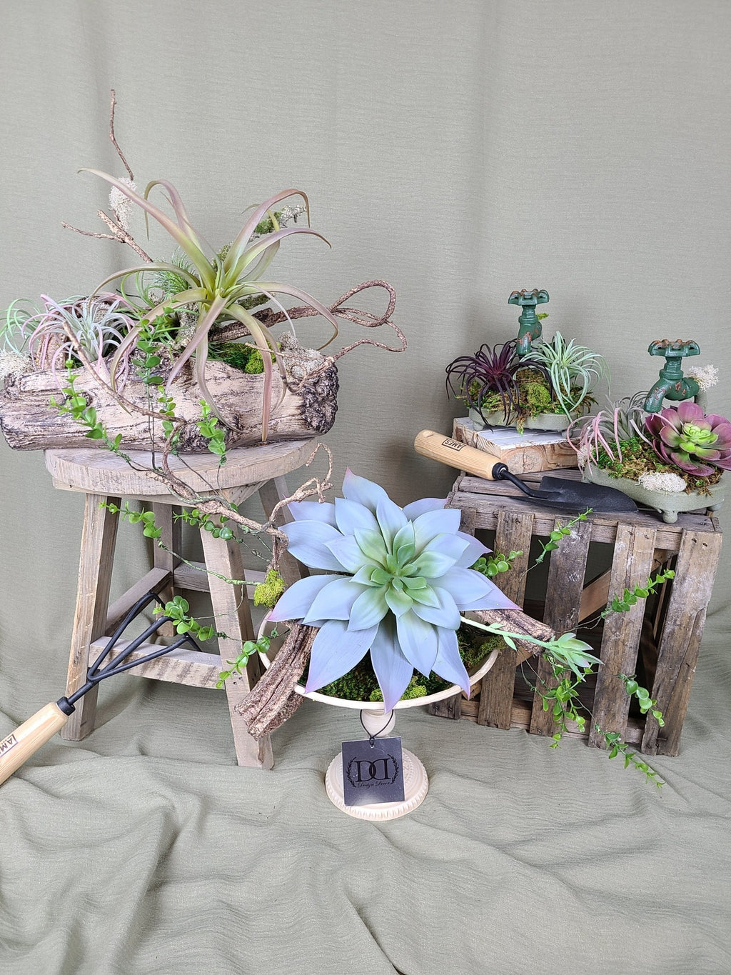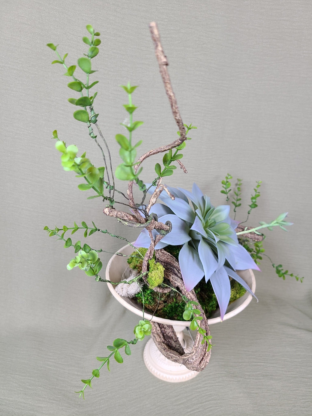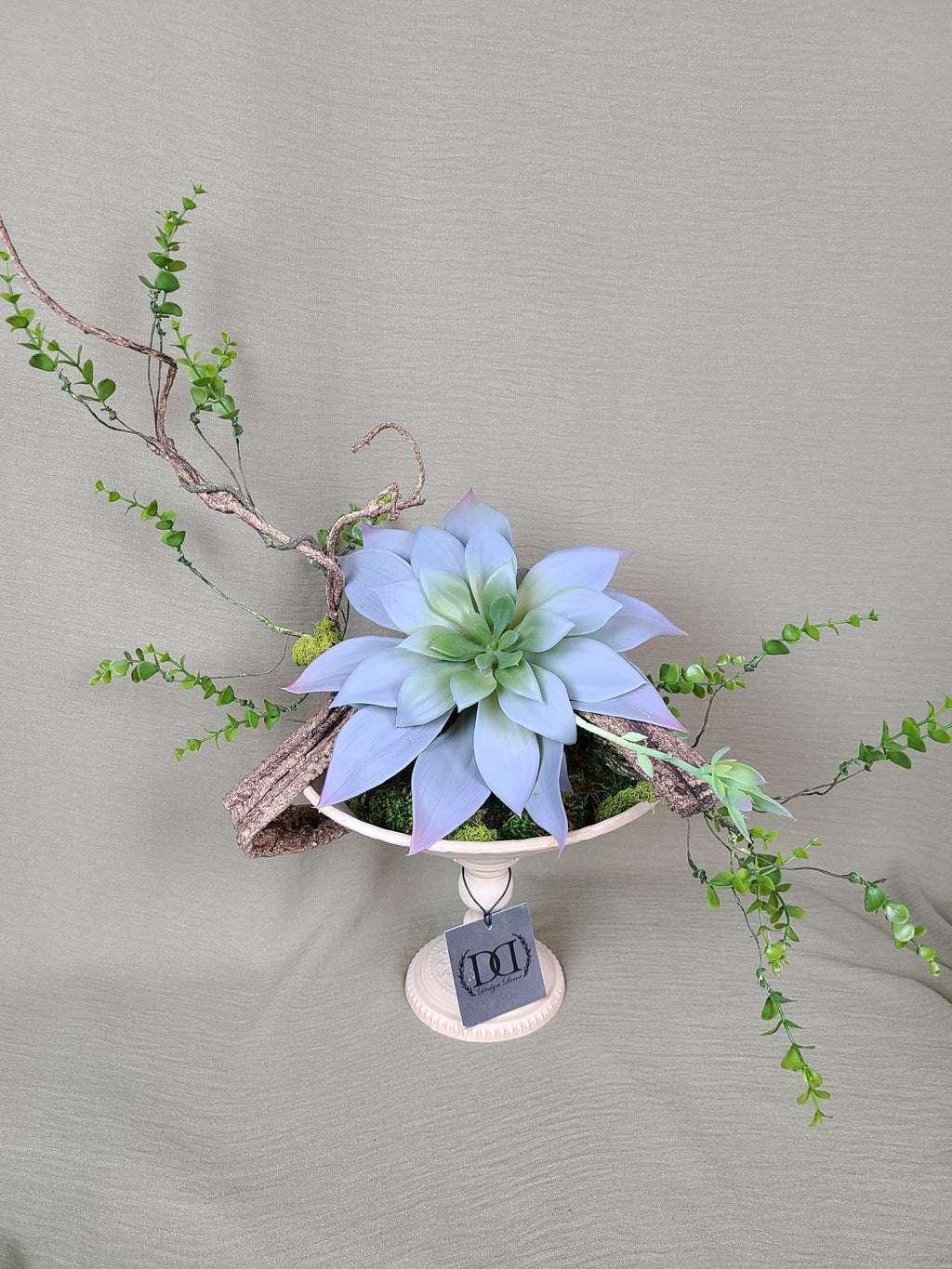 Large succulent in this pedestal compote with assorted moss twigs and branches to complete this realistic look. Take home a succulent today!