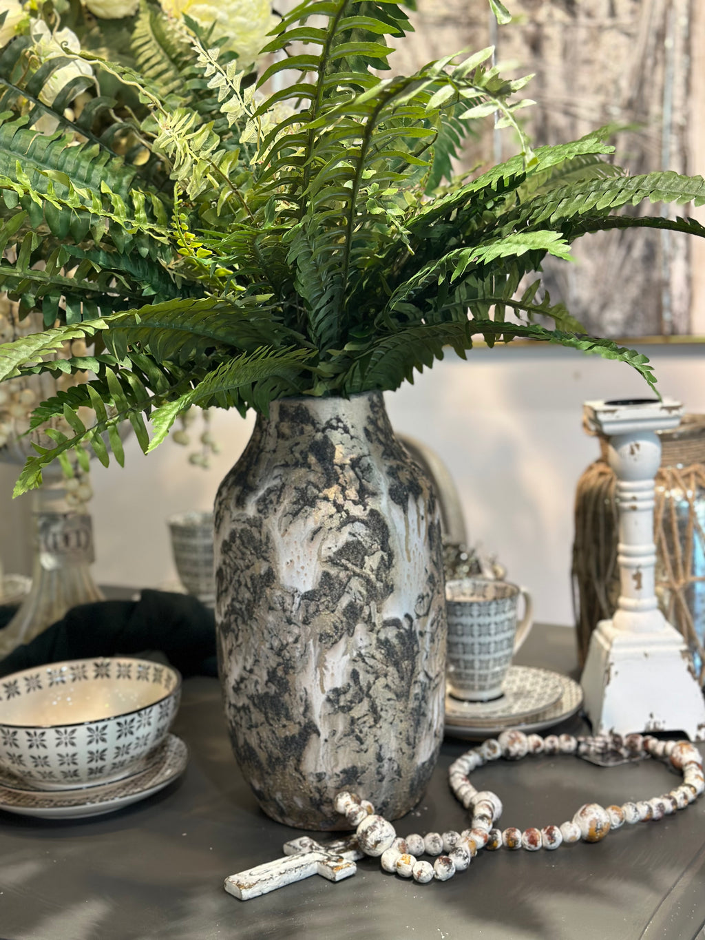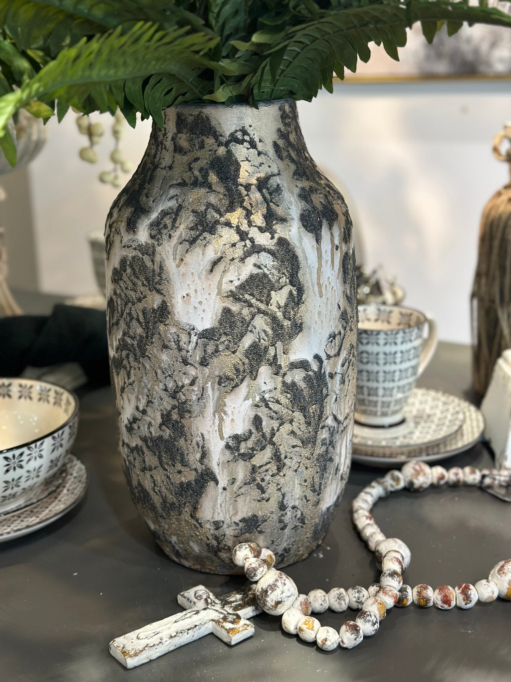 Indulge in luxurious home decor with our 16" Dark Gold Jarra Vase. This exquisite piece adds an elegant touch to any space with its sophisticated dark gold color and unique jarra shape. Display it on its own or fill it with your favorite flowers for a stunning centerpiece. Elevate your interior design with this opulent vase.