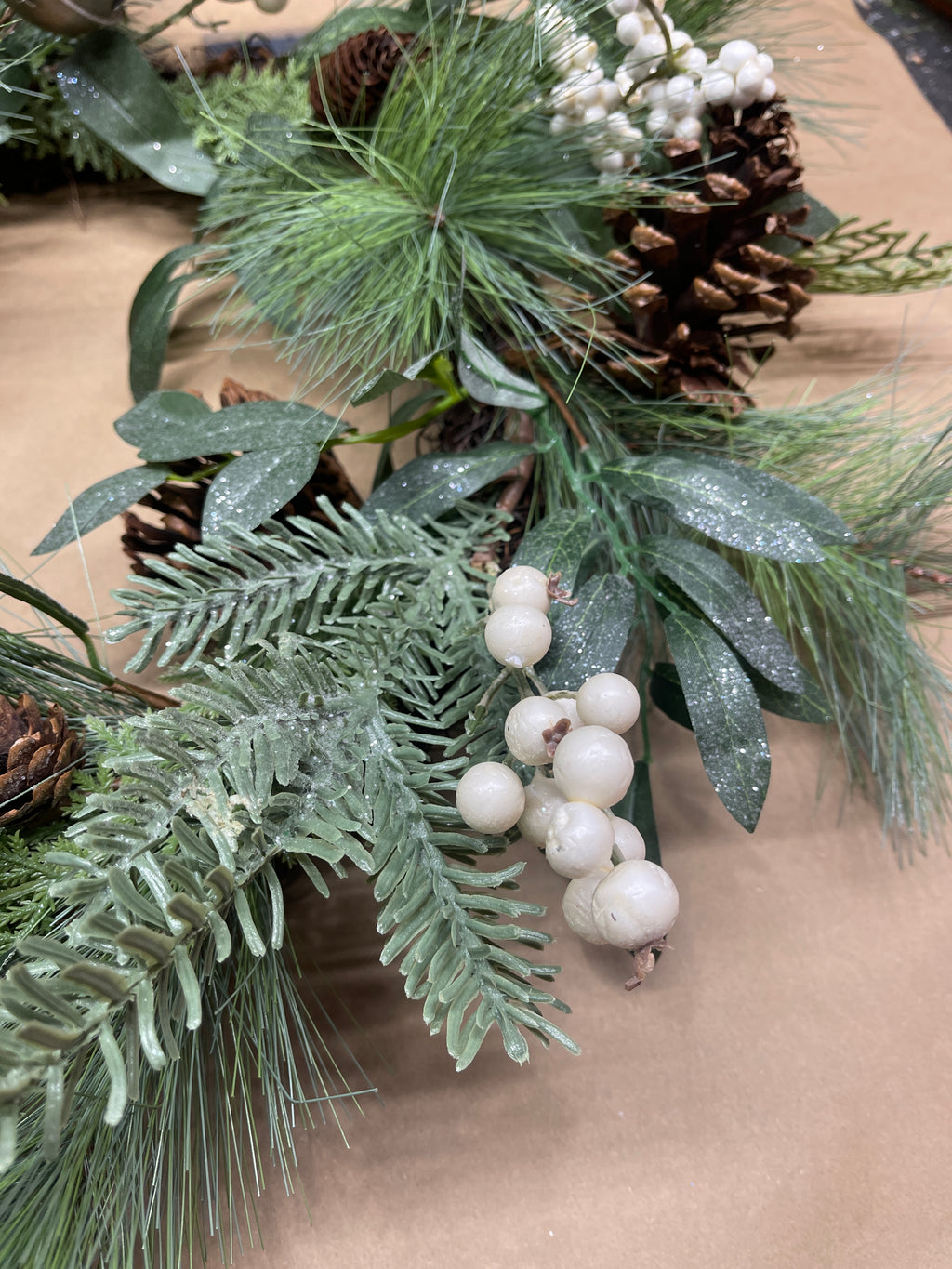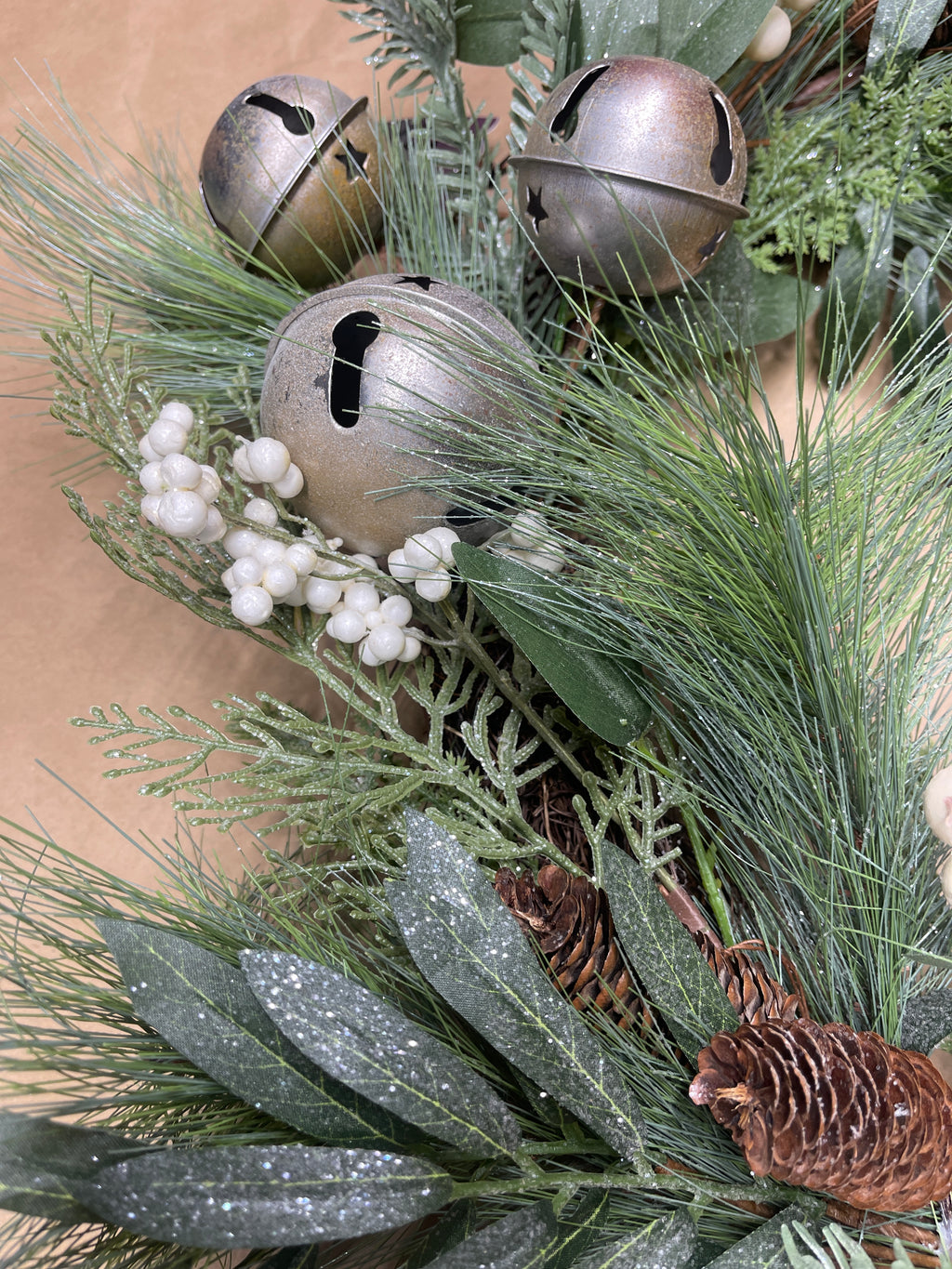 Add a touch of winter magic to your home with our JINGLE BERRY WREATH. Adorned with mixed greens, silver accents, and weathered bells, this beautifully classic wreath also features a hint of sparkle from the white berries. Embrace the season with this elegant and exclusive addition to your decor.