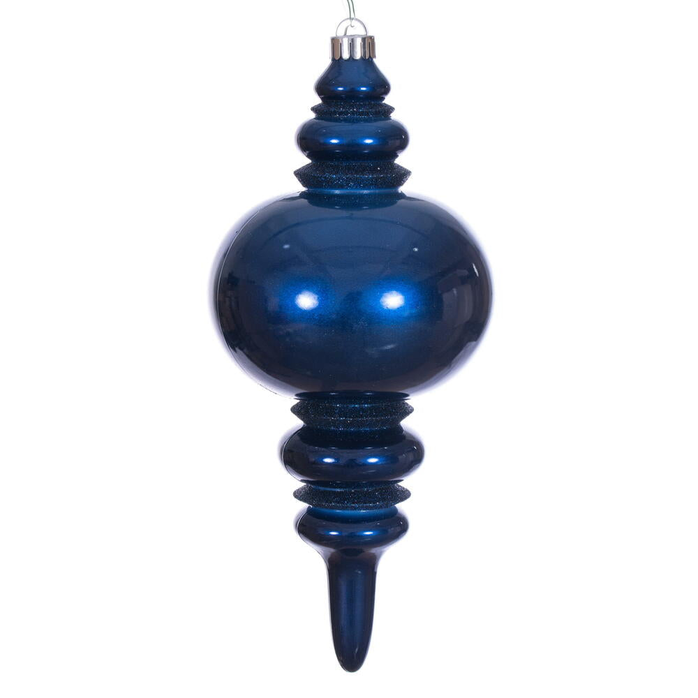 13" Midnight Blue Candy Glitter Finial UV. Each finial measures 13 inches tall by 5.8 inches wide, is made of shatterproof plastic, and features a candy finish with glitter accents. The finial is rated for indoor and seasonal outdoor use. It features wire that is looped through the neck of the ornament and cap for hanging, ensuring that the cap doesn't fall off.