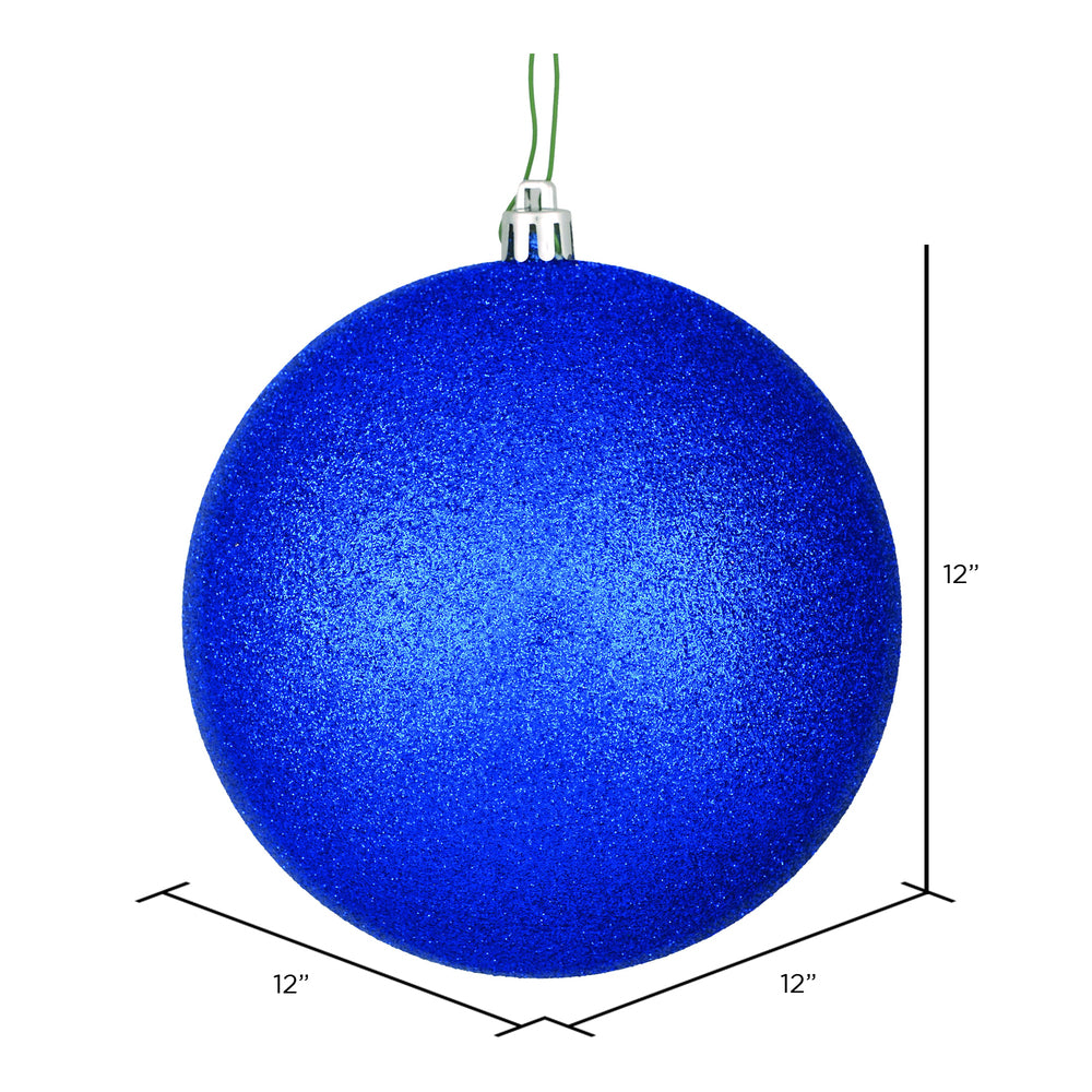 12" Midnight Blue Glitter Ball Ornament. This ornament features glitter finish that will add shimmer to any holiday decorating project. This item is made from shatterproof plastic for extended protection from breaking. The cap is drilled and looped with floral wire to ensure it is reliable and ready to hang. This unique ornament is an exceptional addition to any collection as it matches well with a variety of décor and goes perfectly on a holiday tree.