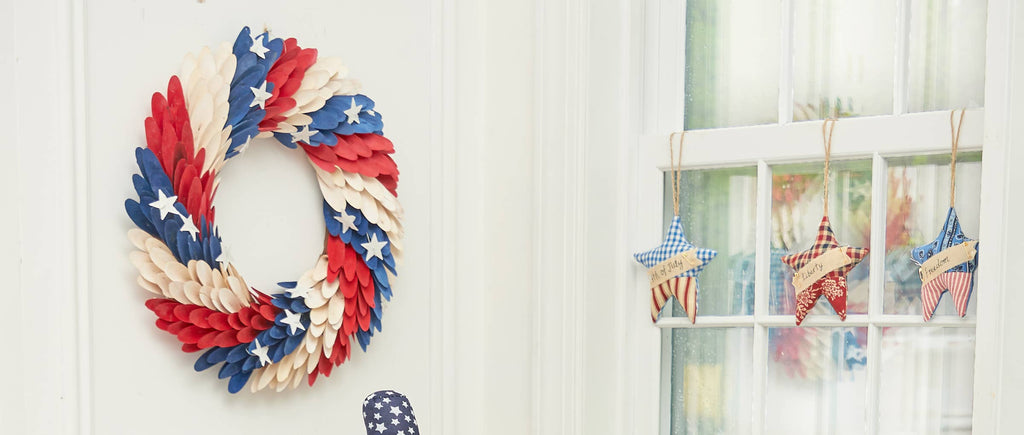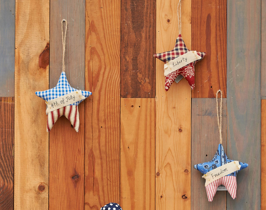 Show your patriotic spirit and love for the USA with these charming patchwork ornaments. Great for Memorial Day, Labor Day, Fourth of July or everyday. Hang by a window or in a tree at Christmas time! Stars come in three varieties; the Freedom star, the 4th of July star, and the Liberty star. Product dimensions are 6" x 6". Made of Cotton.