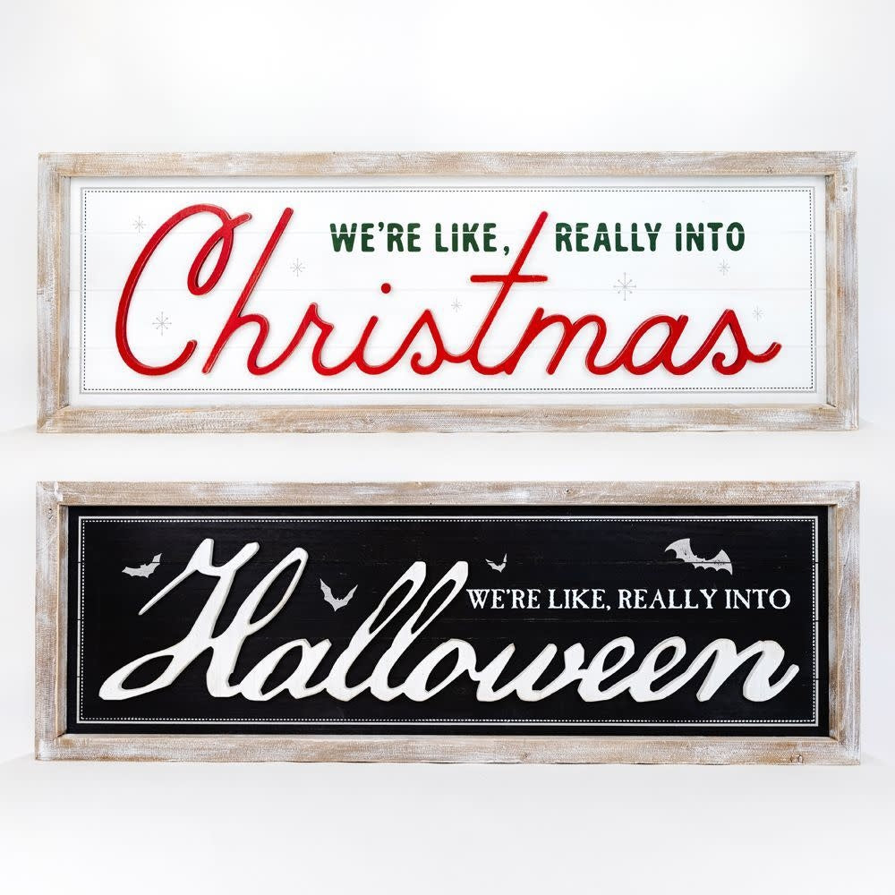 Celebrate your love for the holidays in oversized style with this charming reversible wooden sign, featuring bold, scripted typography and a perfectly distressed finish. One side proclaims your Halloween spirit with bats and gothic flair; flip it over for a festive, whimsical nod to your Christmas obsession.