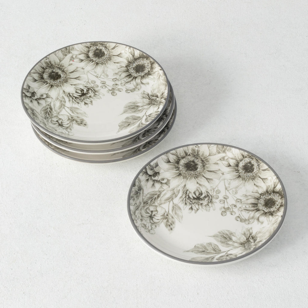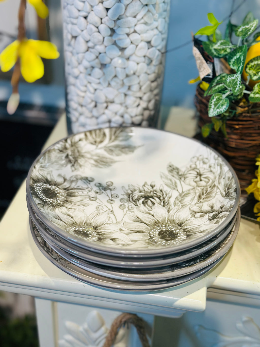 Featuring artwork from our ever-expanding kitchenware line, this beautiful sunflower painting graces all coordinating pieces with style and sophistication. Available here in a dolomite set of four matching plates. Perfect for Easter or spring hosting.