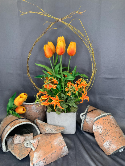 A beautiful, bright arrangement that has everything you're looking for! A mix of tulips and lily's that are eye catching colors, inside a beautiful cement planter, with vines twisted around the top it gives it a look much different than the normal!